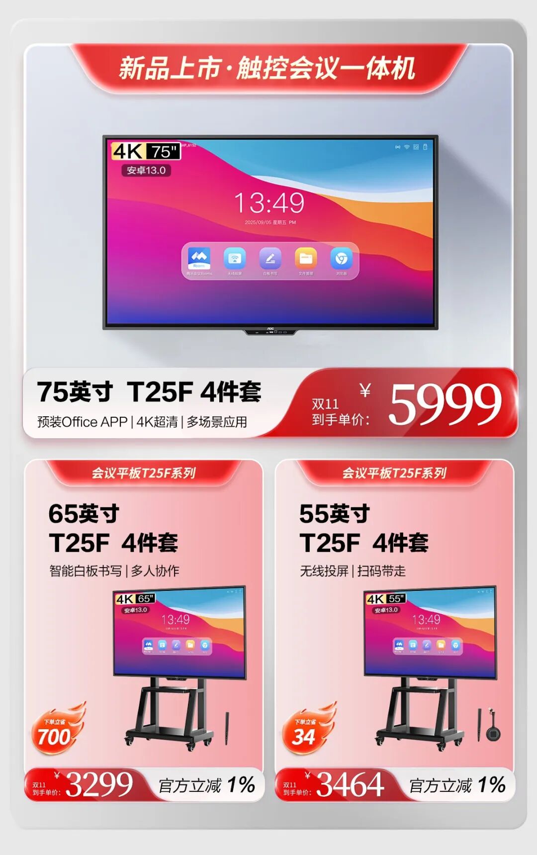 今年双11活动期间,T25F系列75英寸/65英寸/55英寸四件套分别售价为5999、3299、3464元。其中75T25F套装享最高2000立减,同时加赠免费上门安装服务,可以说无论是企业采购、教育装备升级,还是家庭娱乐焕新,T25F系列都能满足你对智慧终端的所有想象。